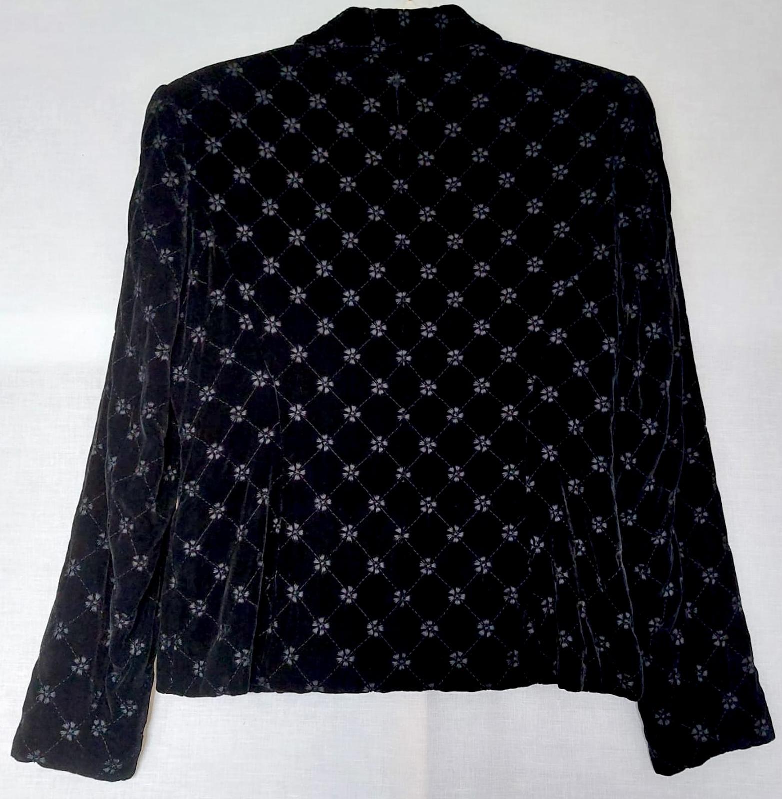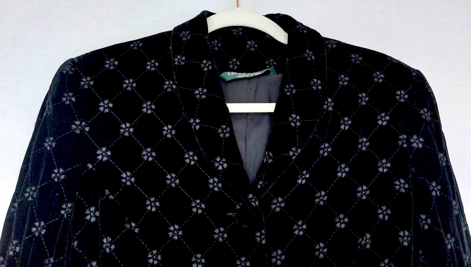 This beautiful vintage-inspired Laura Ashley jacket is crafted from soft black velvet with an elegant embroidered pattern — a diamond lattice sprinkled with tiny floral motifs.