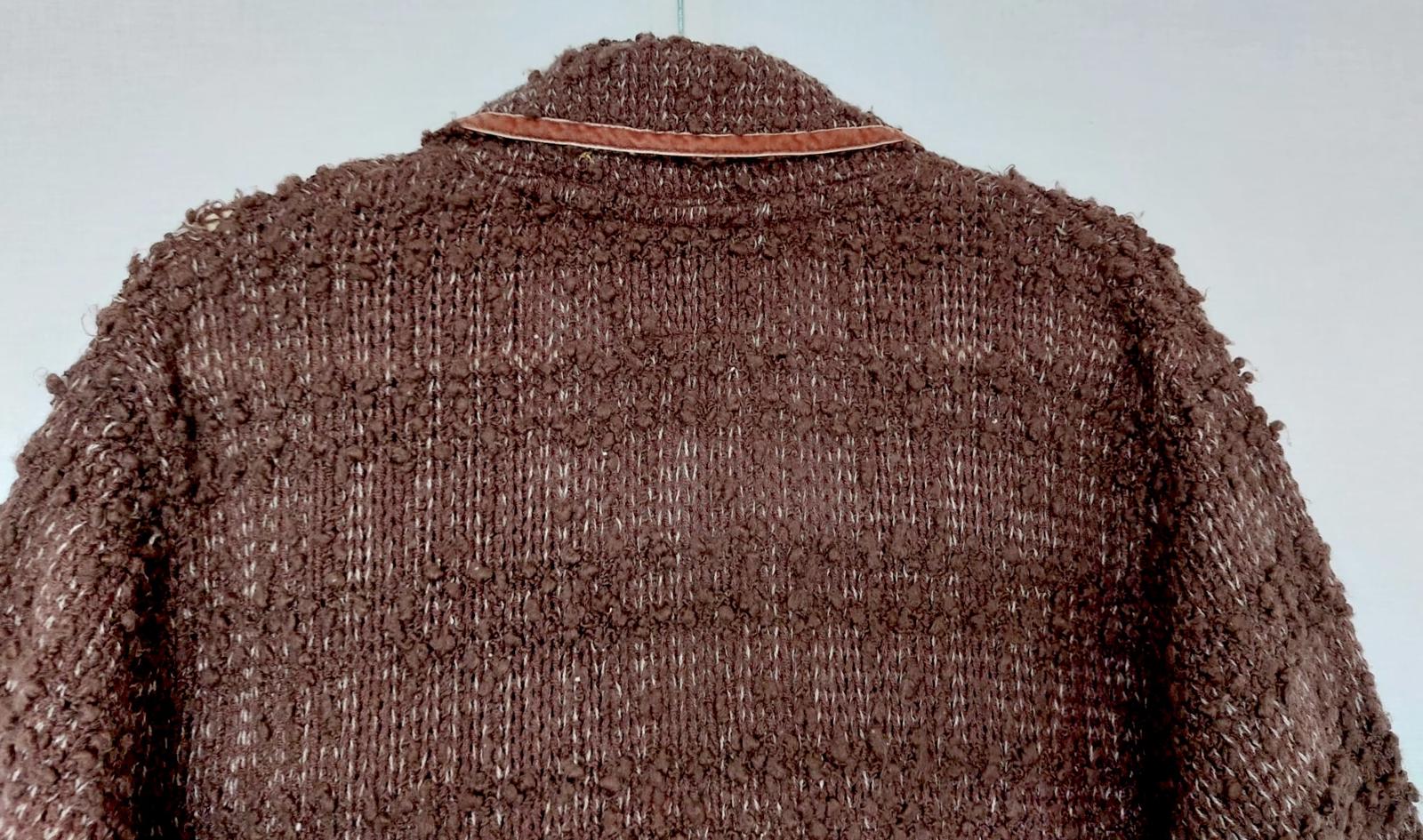 The tailored lapels are beautifully trimmed in brown velvet ribbon, giving depth of contrast to the textured knit.