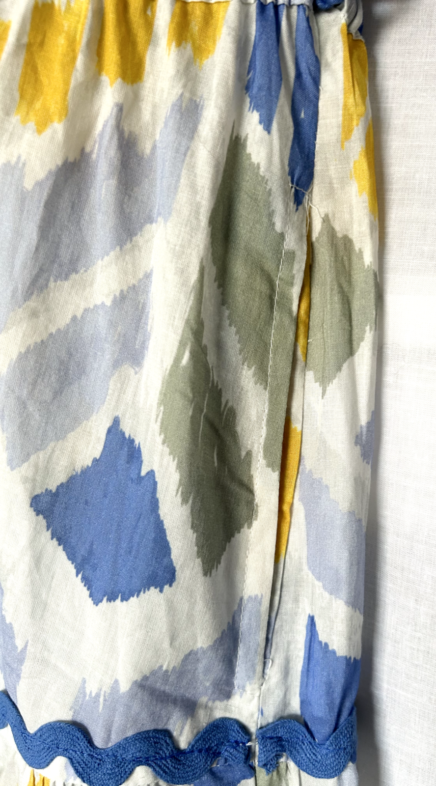 Lovely summer dress, beautiful colour combination of blue, white, pale green and yellow in a geometric pattern.