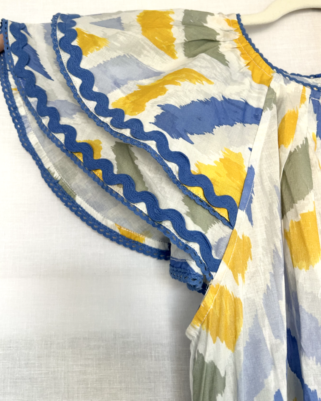 The dress has pockets and cap frill sleeves with two layers of fabric and each cuff is trimmed with ric rac embroidery.