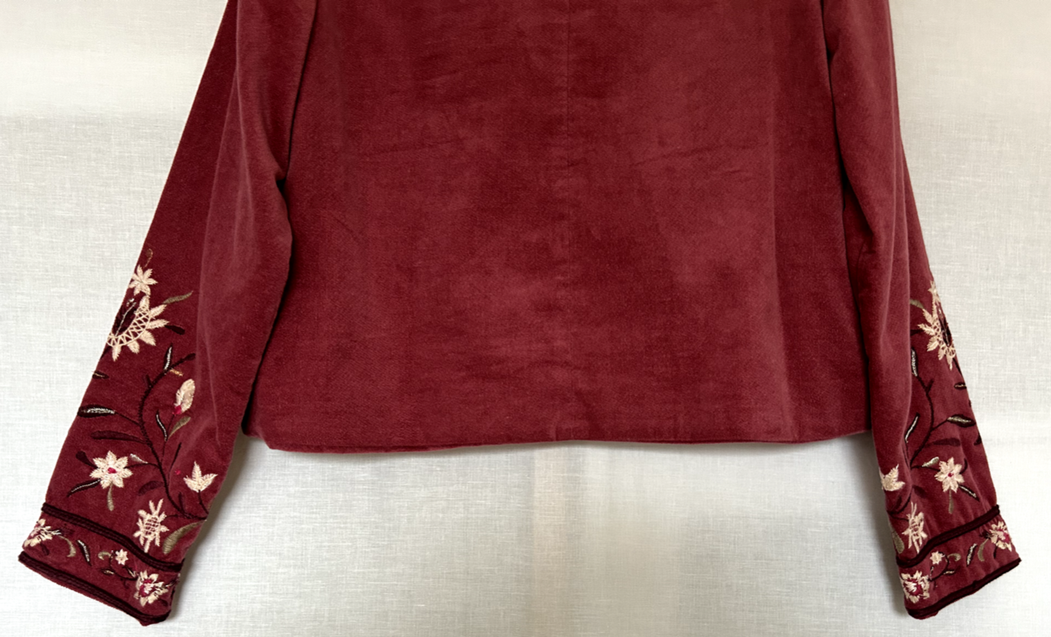 The rose coloured velvet and beautiful embroidery accents add real elegance to this jacket, which is fully lined.
