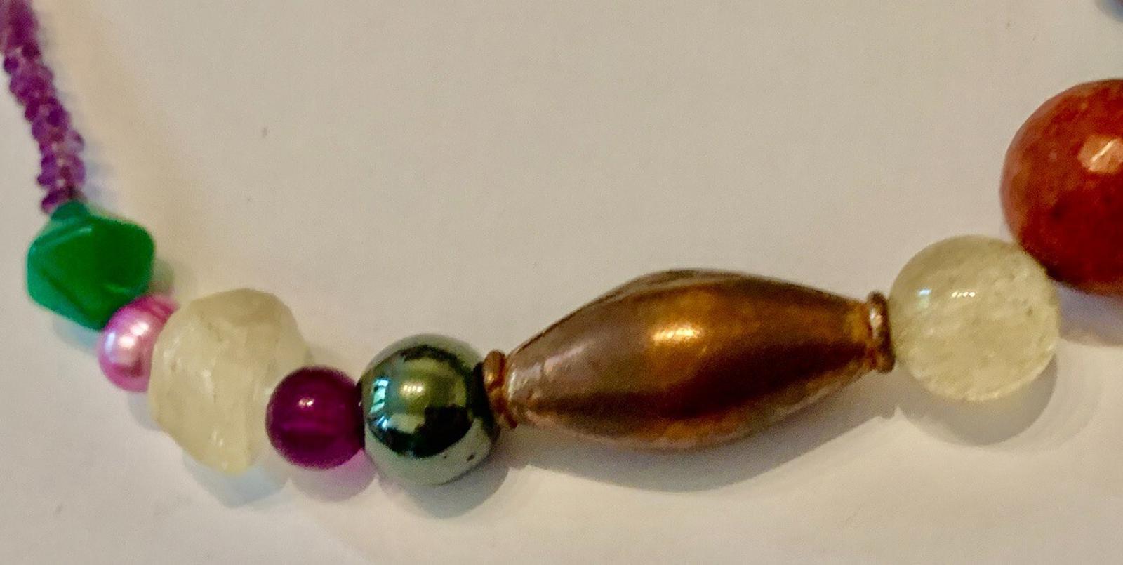 Interspersed beads of pearl, obsidian, aventurine, crystal quartz, chalcedony, rose quartz, amethyst and pyrite.
