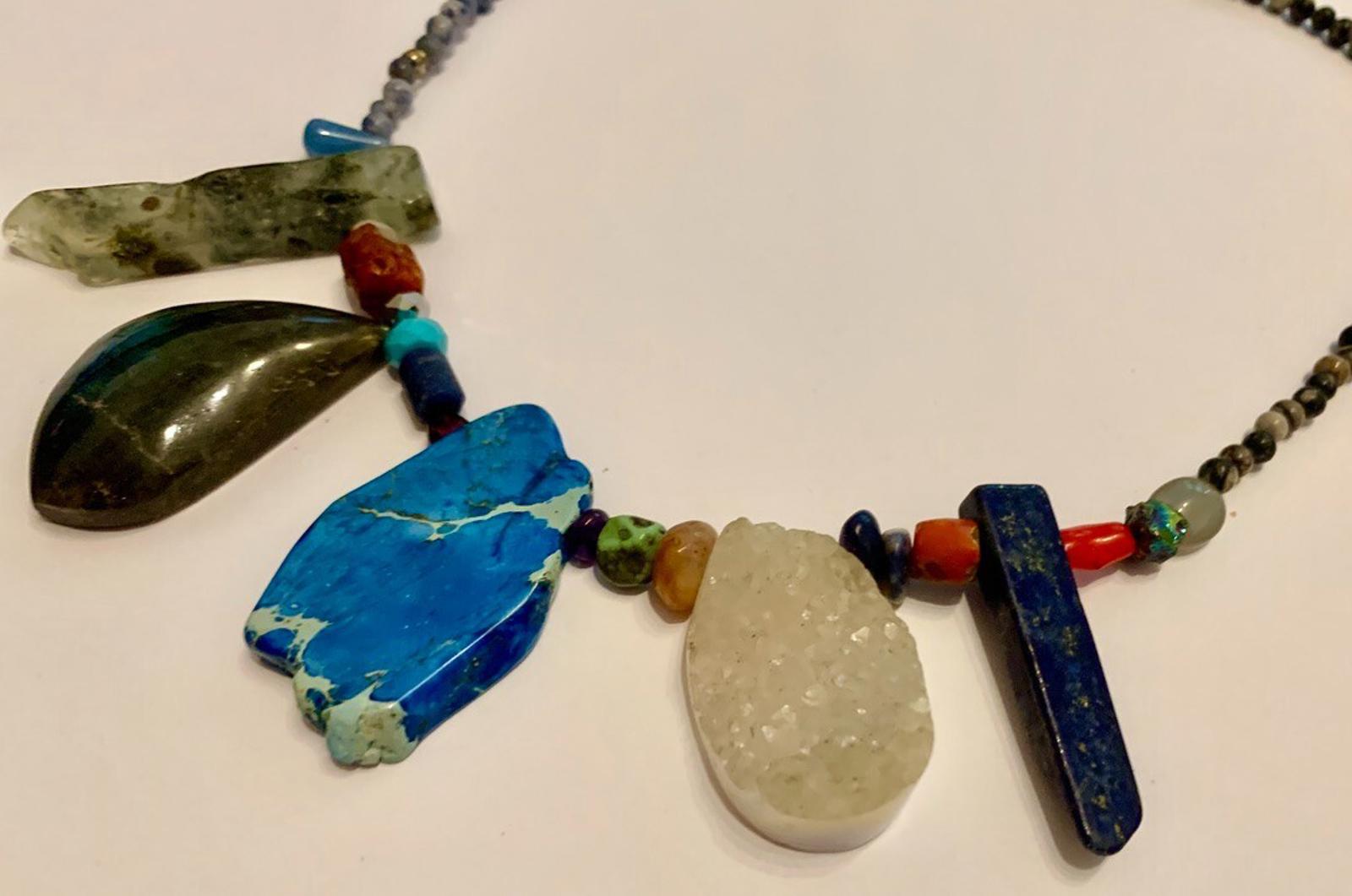 Quirky Boho necklace of lapis lazuli, labradorite, druzy quartz, coral, rutilated prehnite stones, with a silver clasp.