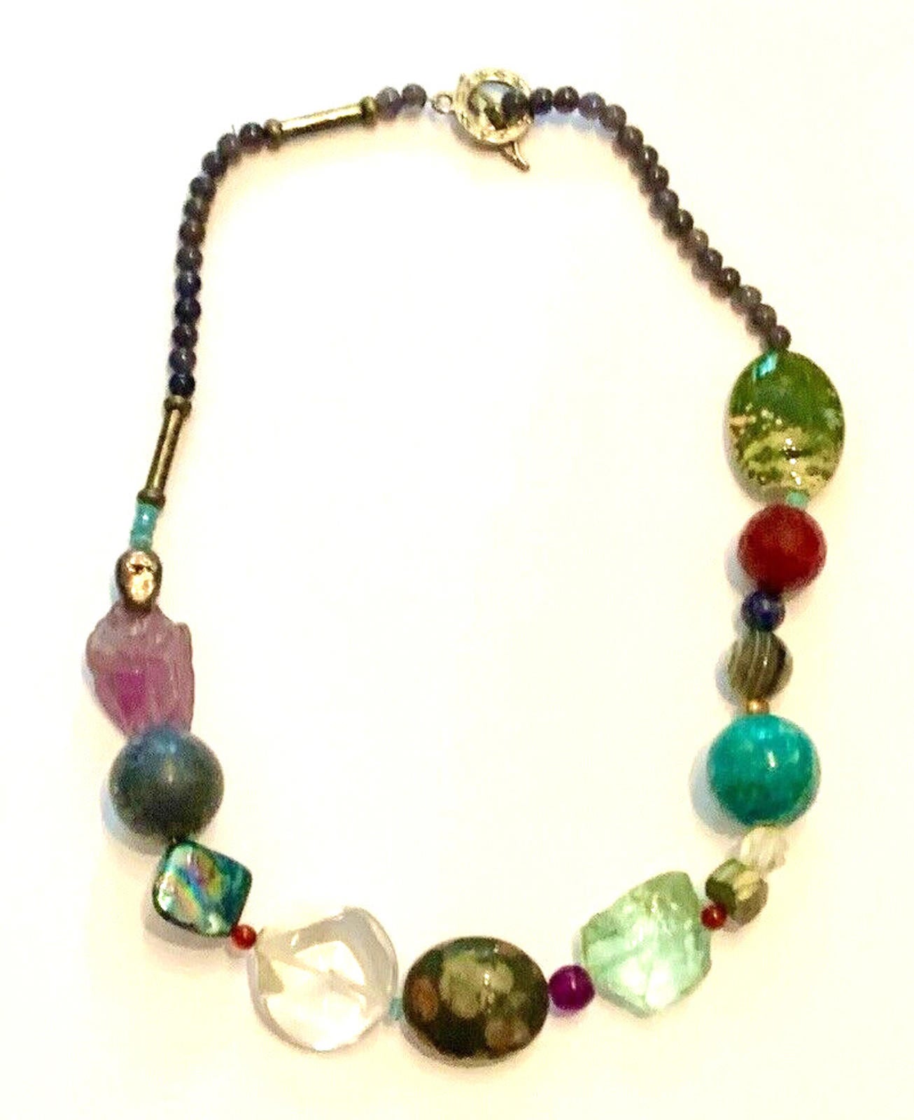This beautiful necklace has been created from minerals and gemstones gathered in complementary mixture of inspired colours.