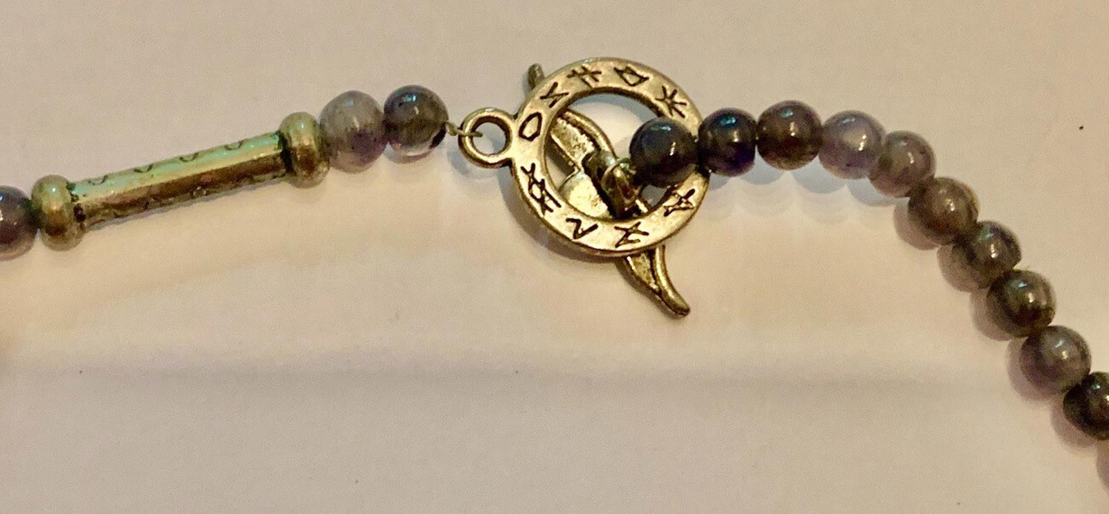 It is strung on strong steel thread and finished with a hammered silver toggle clasp.
