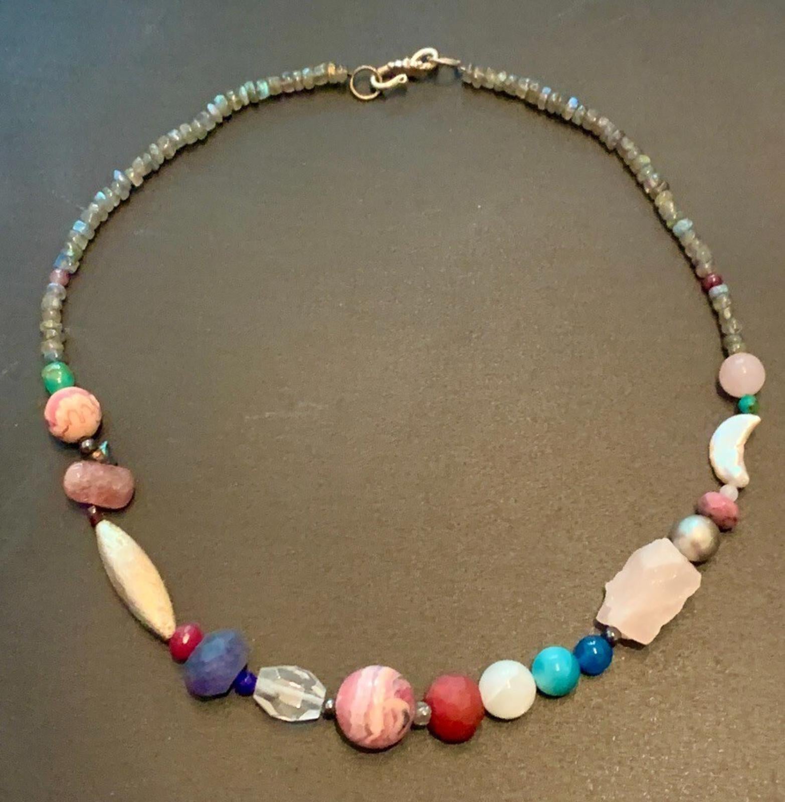 Interspersed beads of kyanite, garnet, tourmaline, turquoise, rhodonite and moon shaped pearl