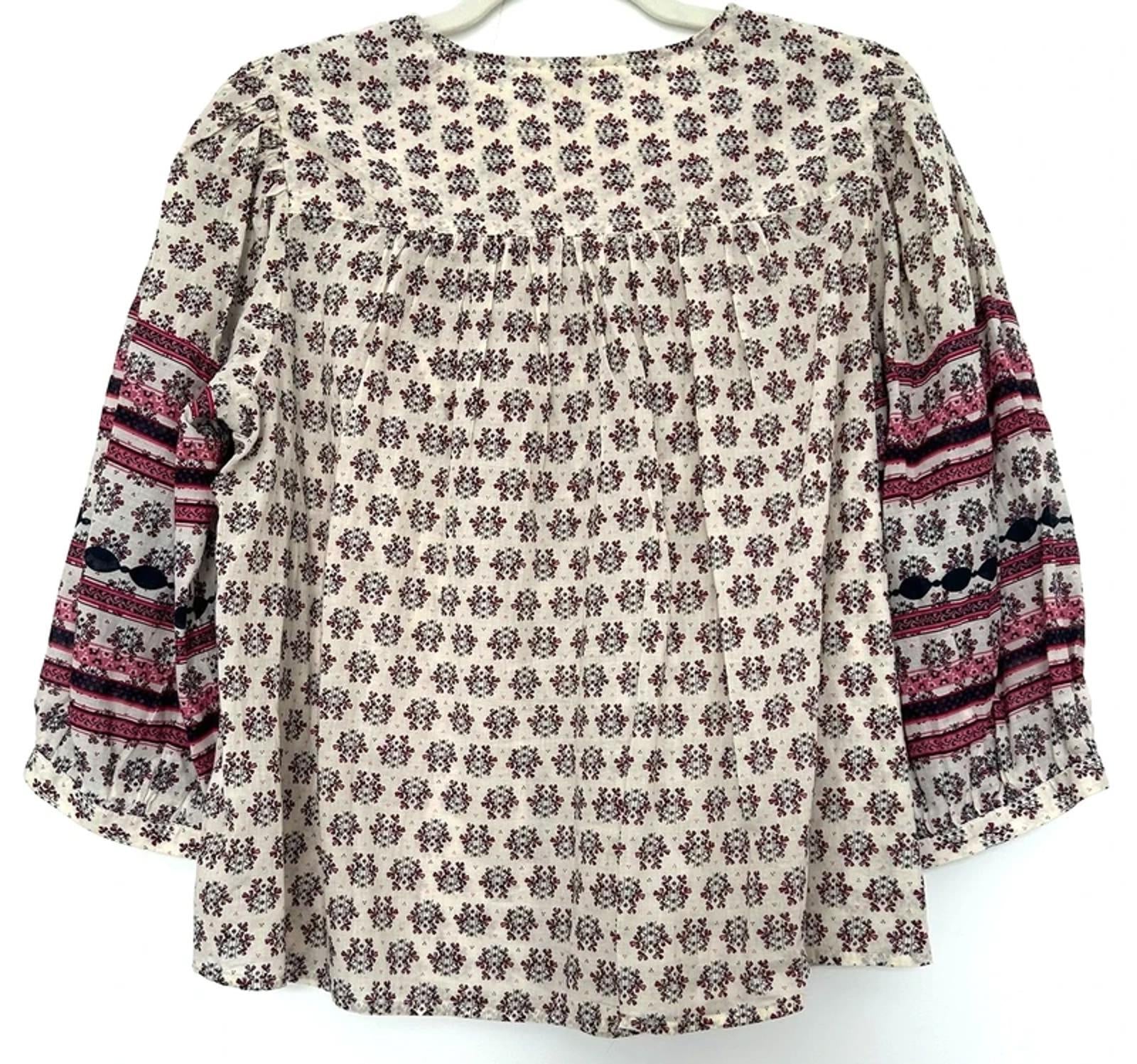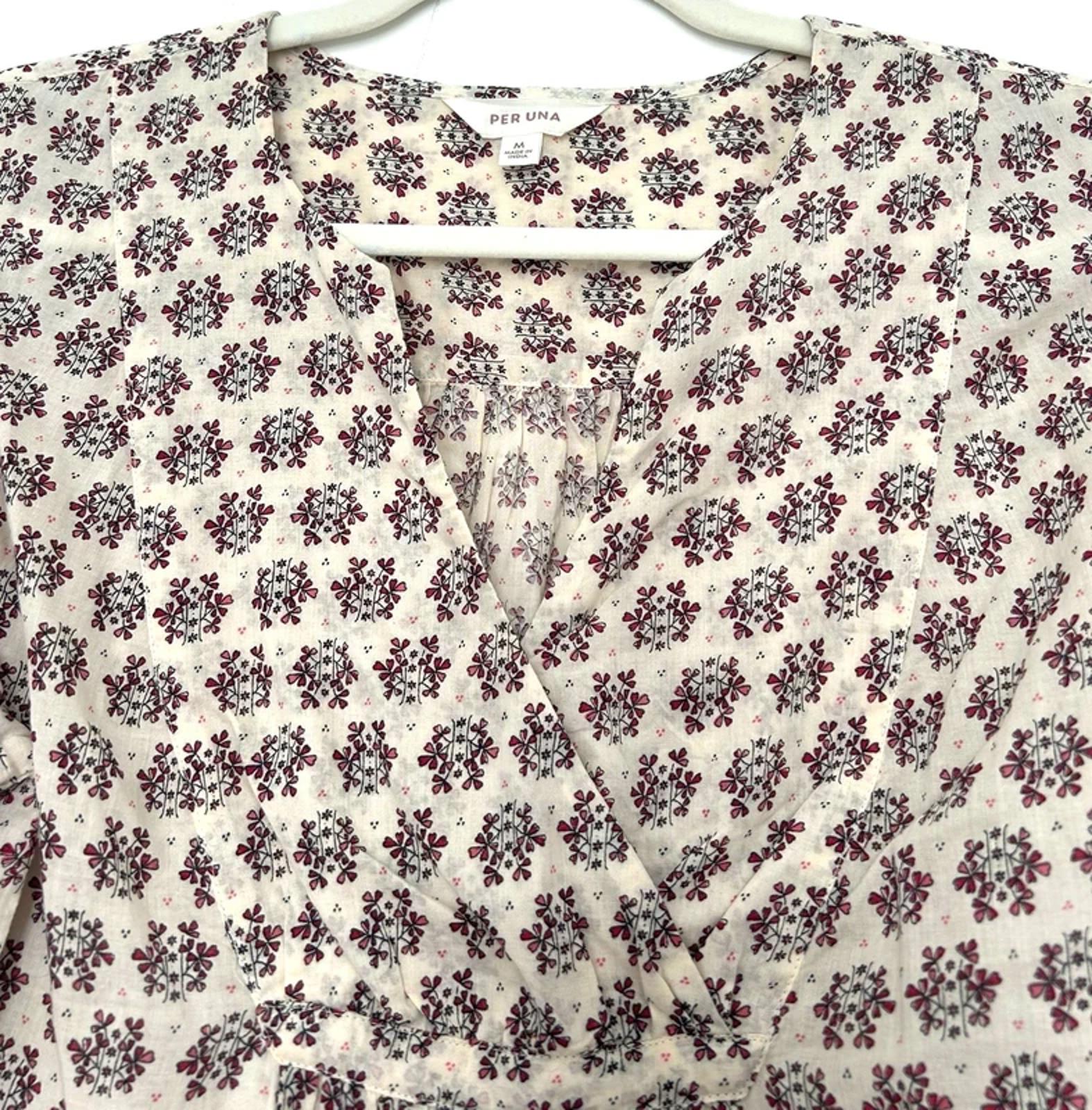This pretty Per Una blouse features a delicate all-over block printed floral design in rich shades of burgundy, black and pink on a soft cream background.