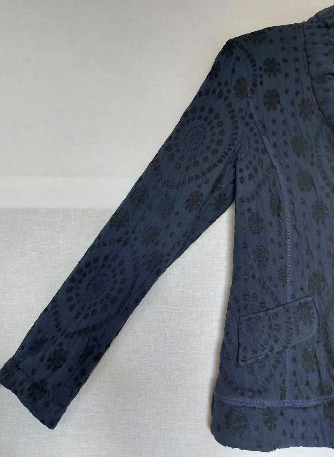 The fabric carries a raised, almost quilted design, forming circular and floral motifs that give the jacket quiet depth and a sense of movement.
