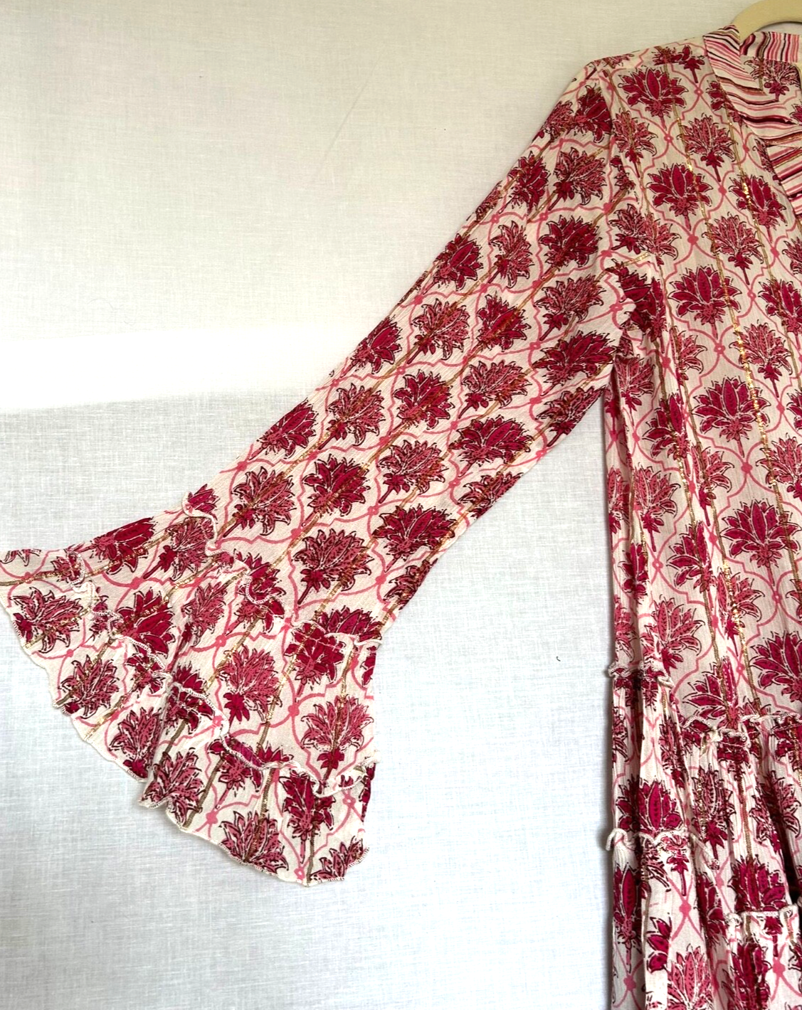 Super pink tunic with v-neckline. The sleeves have two tiers of frill at the cuff. A lovely feminine style.
