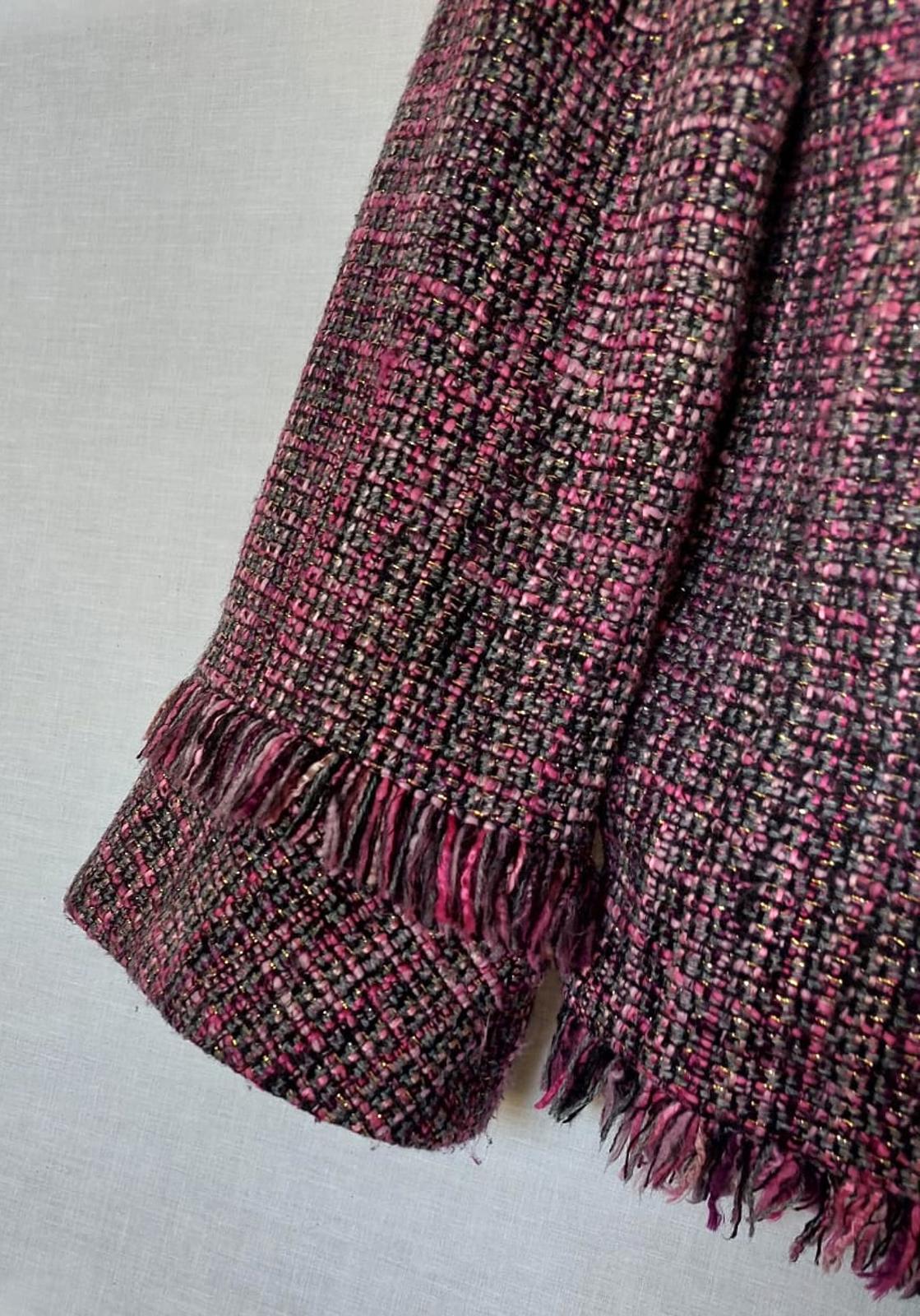 Fabulous tweed jacket feels like a little piece of vintage romance, woven in deep berry pinks and soft charcoal threads with a touch of gold thread too - stunning.