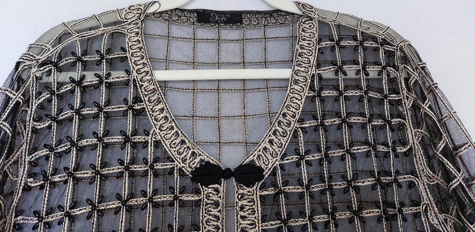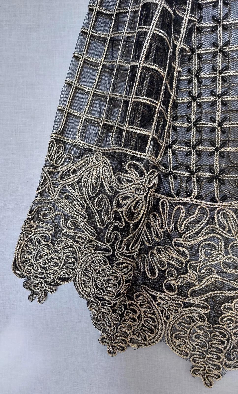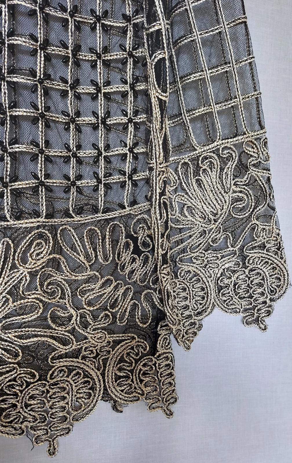 An exceptionally beautiful embroidered jacket, crafted from semi sheer black mesh and lavishly embellished with metallic appliqué work.